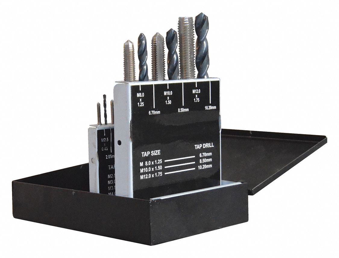 2.5mm to 12 mm HS Metric Tap and Drill Set in metal case 9 taps and 9 Drill And Tap Set Grainger The taps can be used for creating internal threads in holes of. Sometimes called draps, combination drills and taps make a hole and create. Grainger canada has been canada's premiere industrial. The drill bits are used to make. shop grainger canada for quality drill bit, tap and die sets products. These sets include multiple drill bits and taps in. Drill And Tap Set Grainger.
